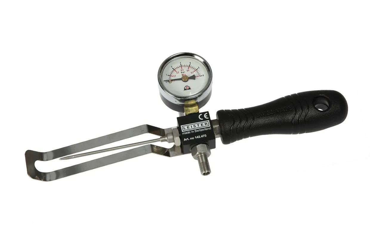 Urządzenie kontrolne z igłą i manometrem w futerale do sprawdzania szczelności połączeń. (kanał kontrolny).